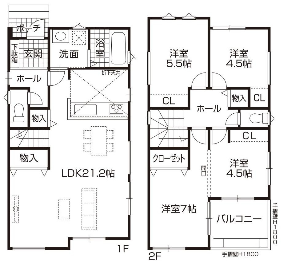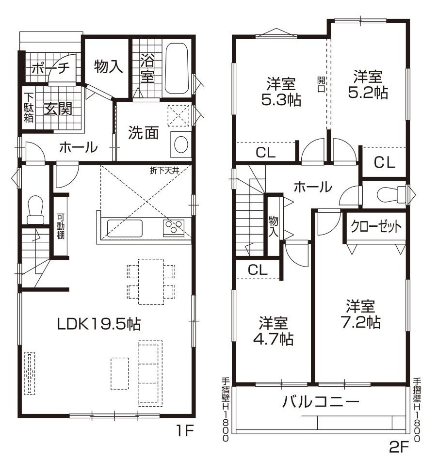 1号棟 1F:LDK19.2帖!リビングイン階段♪ダイニング物入♪キッチン可動棚♪ホール物入♪2F:洋室6.7帖・洋室5.2帖・(洋室5.7帖・洋室5.7帖) CL設置♪廊下物入♪南面バルコニー♪ - 向き