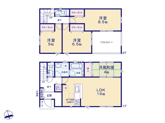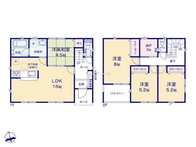 3号棟 1F:LDK16.2帖に隣接する洋風和室4.5帖はお子様の遊び場・奥様の家事室に便利♪2F:主寝室9.2帖 WIC2帖設置!洋室6帖・洋室5帖 CL設置♪廊下物入♪南面バルコニー♪ - 向き