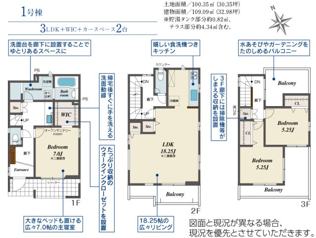 2号棟 1F:LDK19.02帖(マルチスキップ)!吹抜♪オープンサニタリー♪2F:主寝室8.34帖 WIC設置!洋室5.25帖・洋室5.25帖 CL設置♪ファミリークローク♪南面インナーバルコニー - 向き