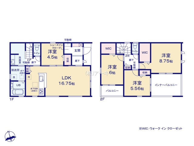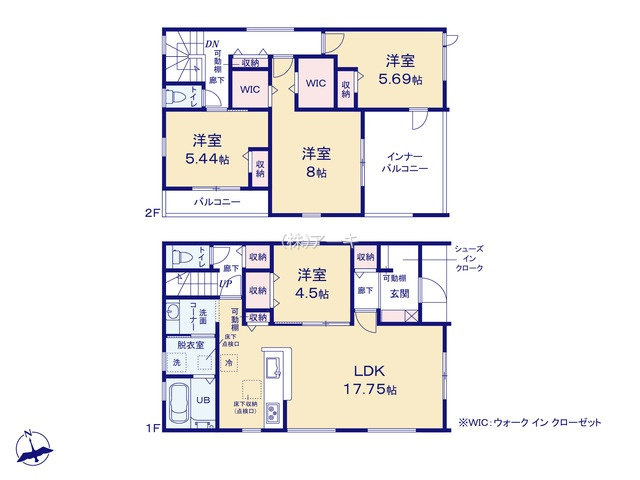 2号棟 1F:LDK広々19帖!便利なパントリー・洗面室収納・ホール収納 収納豊富!!リビングイン階段♪2F:主寝室7帖・洋室5.5帖・洋室5.06帖 WIC設置!ホール収納♪インナーバルコニー♪ - 向き