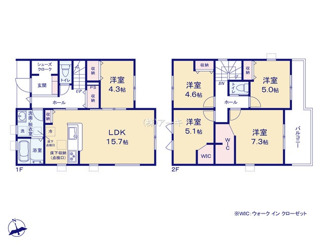 2号棟 1F:LDK18.2帖に隣接する洋室4.1帖はお子様の遊び場・奥様の家事室に便利♪2F:主寝室7.7帖+ウォークインCL、洋室6.0帖・洋室5.4帖 CL設置♪ - 向き