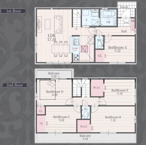 5号棟 1F:LDK17帖!納戸5帖 CL設置!リビングイン階段♪スタディーカウンター!2F:主寝室7.5帖・洋室5.2帖 WIC設置!洋室5.5帖 CL設置♪洋室5帖♪バルコニー♪ - 向き