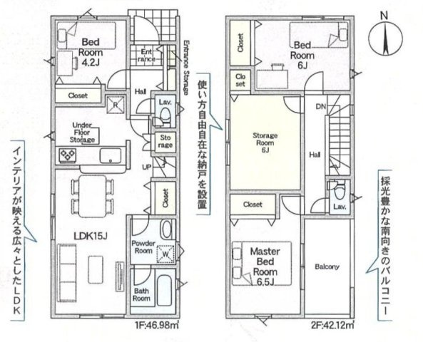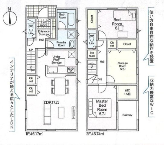 1号棟 1F:LDK18.5帖に隣接する畳コーナー3帖はお子様の遊び場・奥様の家事室に便利!2F:洋室6.7帖 WIC1.5帖設置!洋室6.7帖・洋室5.2帖 CL設置♪納戸2帖!南面バルコニー♪ - 向き